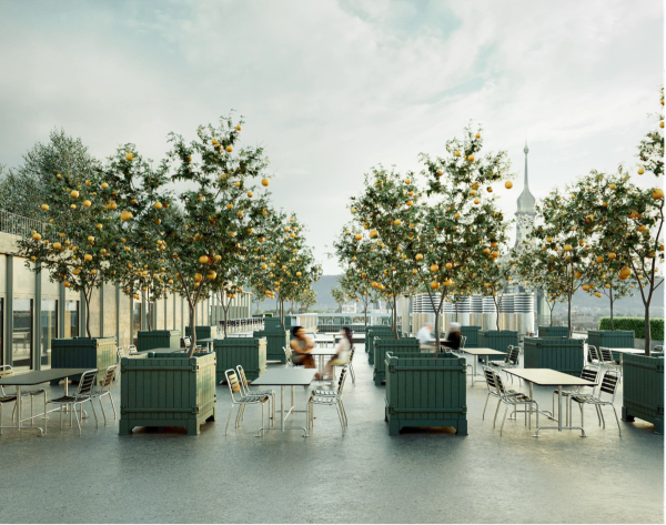 Das Varianzverfahren "Destination Jelmoli - Dachlandschaft" wurde von Vogt Landschaftsarchitekten AG gewonnen. Es entsteht eine Dachterrasse als öffentlicher Raum mit vielfältigen Nutzungsmöglichkeiten - unter anderem ein Restaurant, ein Eventbereich, Pausen- und flexible Arbeitsräume für mobiles Arbeiten, Gastronomie wie Pop-up-Stände sowie Räume für Kultur- und Fitnessangebote.